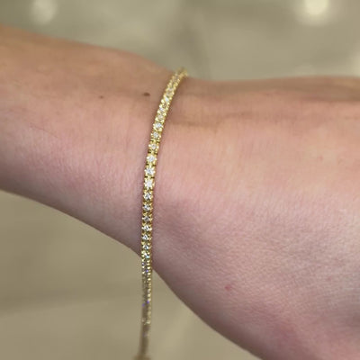 Il design di questo bracciale tennis in oro giallo 18 carati con montatura a filo è pensato per valorizzare ogni dettaglio: diamanti naturali taglio brillante sono disposti lungo la linea del bracciale creando un effetto sofisticato e luminoso.